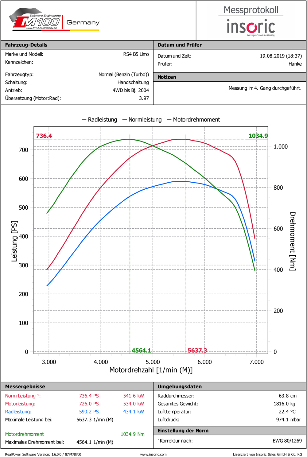 Kundenfahrzeug RS4 B5 mit 2,7L und Hardware XL Umbau. Der Ladedruck war von 2,7 auf 2,0 bar programmiert. Die Leistung lag bei 679PS und 838NM. Der Kunde war nicht zufrieden mit dem Ergebnis und beauftragte uns mit einem Update für seinen Motor. Nach den ersten Logfiles drehten wir das Konzept mit weniger Ladedruck (2,3 auf 1,8 bar) und der Optimierung von Zündung und Benzin. Ergebnis: 698PS und 853NM. Die Motor arbeitet jetzt im grünen Bereich und das Auto fährt stärker als vorher. Der Kunde hat so mehr und länger Freude an seinem Auto.
